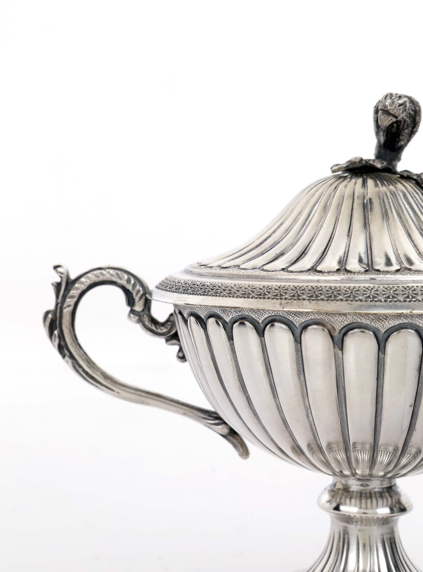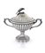 Zuccheriera biansata con coperchio a forma di coppa sormontata da figura di...