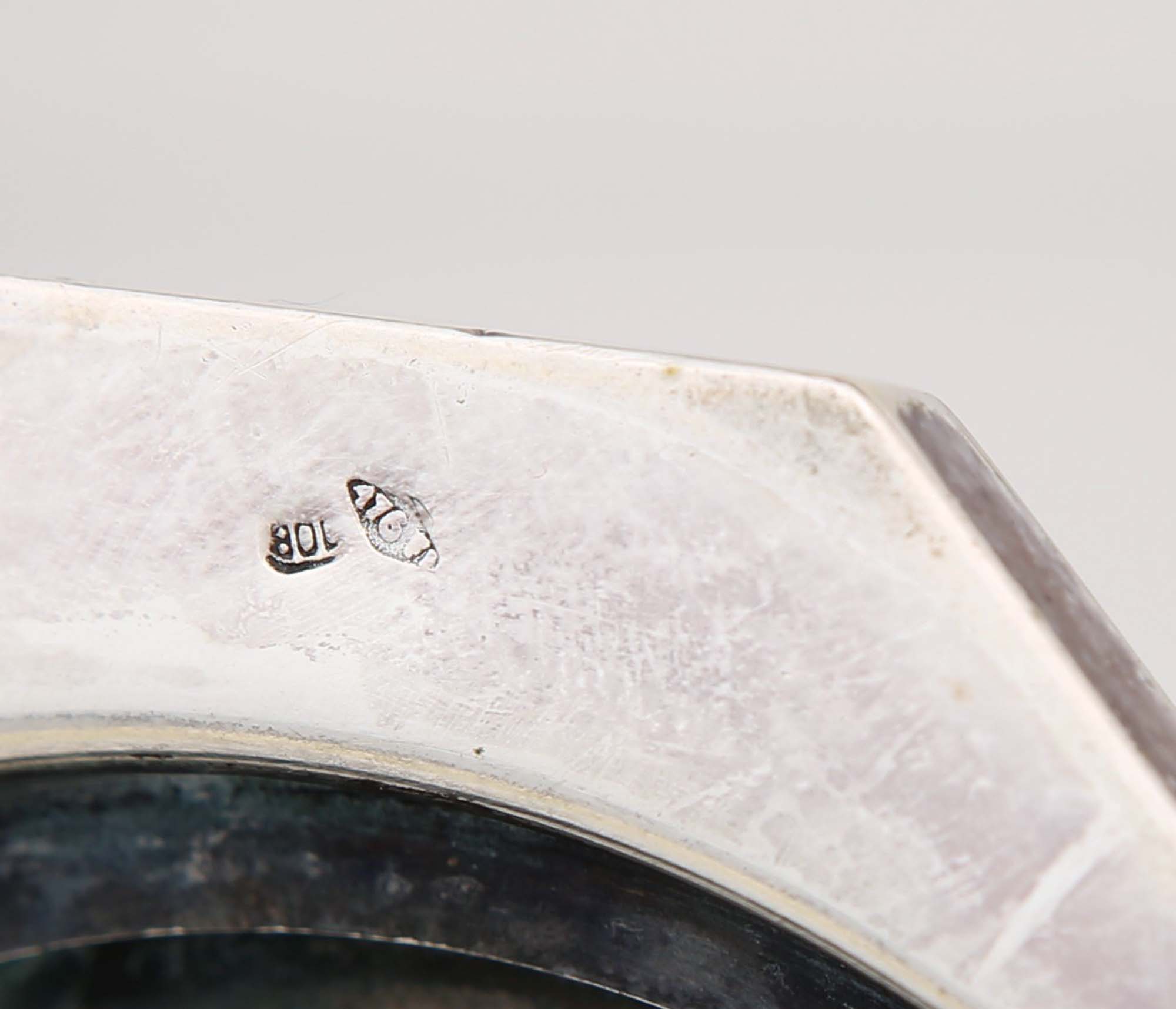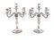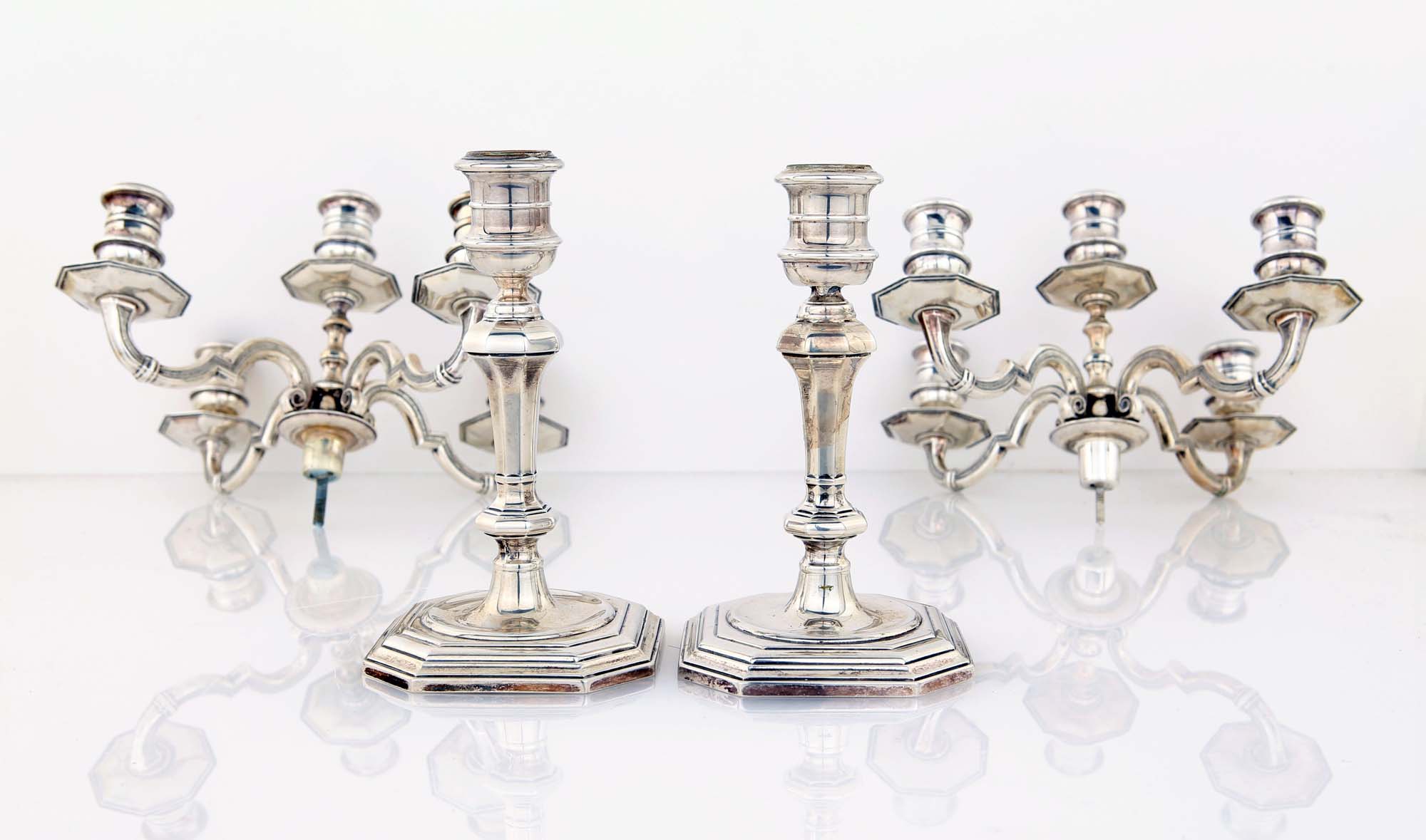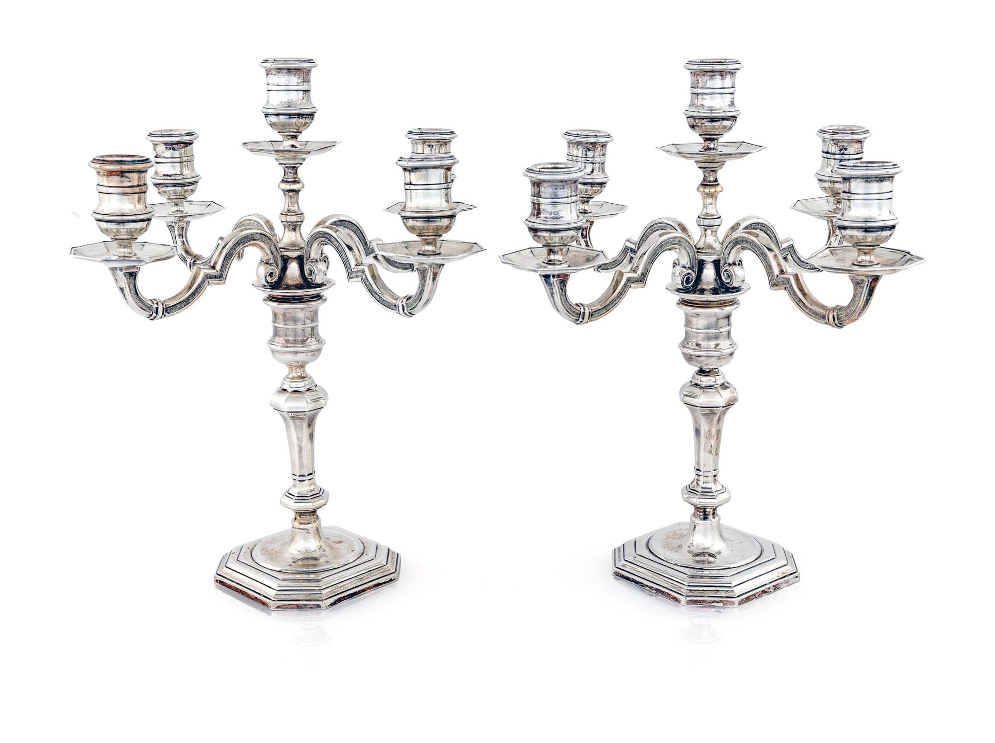 Coppia di candelabri a cinque luci a doppio uso stelo poliedrico su piede ottagonale altezza cm 32 (candeliere cm 18,5) - peso complessivo gr. 2032