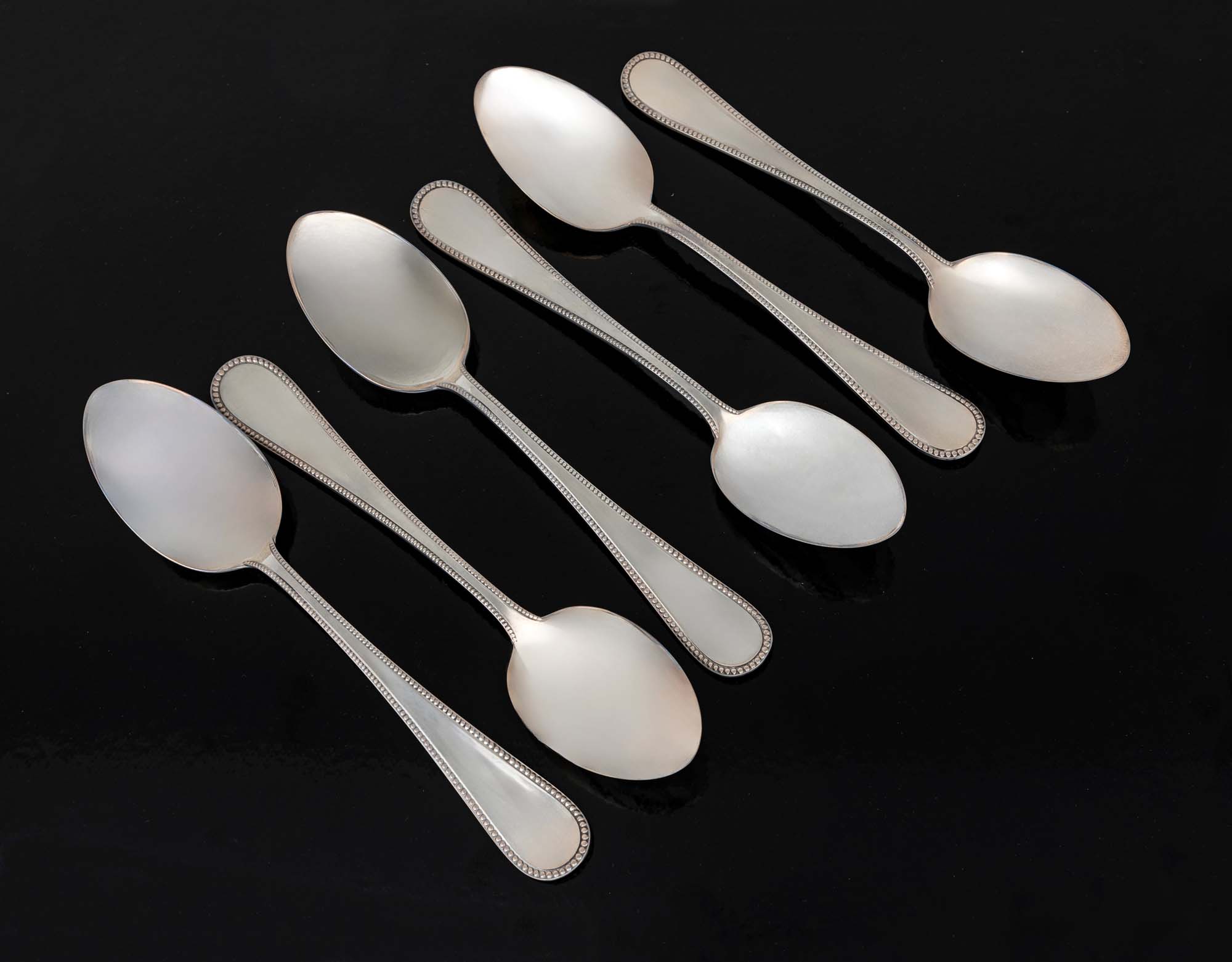Sei cucchiai da dessert impugnatura arrotondata sottolineata da perlinatura cm 17,7 - peso complessivo gr. 328