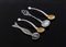 Quattro cucchiaini da saliera uno con paletta a forma di conchiglia ed impugnatura a pesce; uno con impugnatura cesellata ed una coppia con esile impugnatura sormontata da una piccola sfera cm 5,5 ca. - peso complessivo gr. 16
