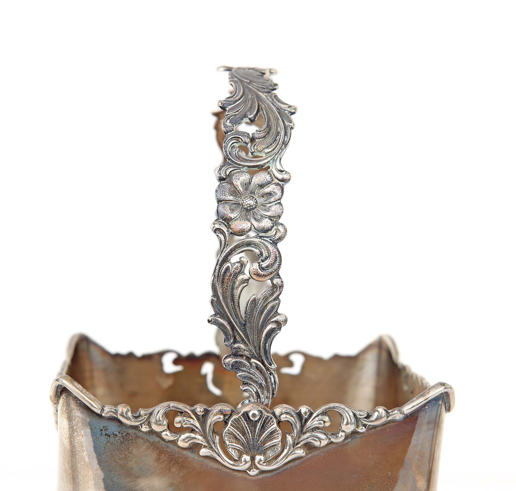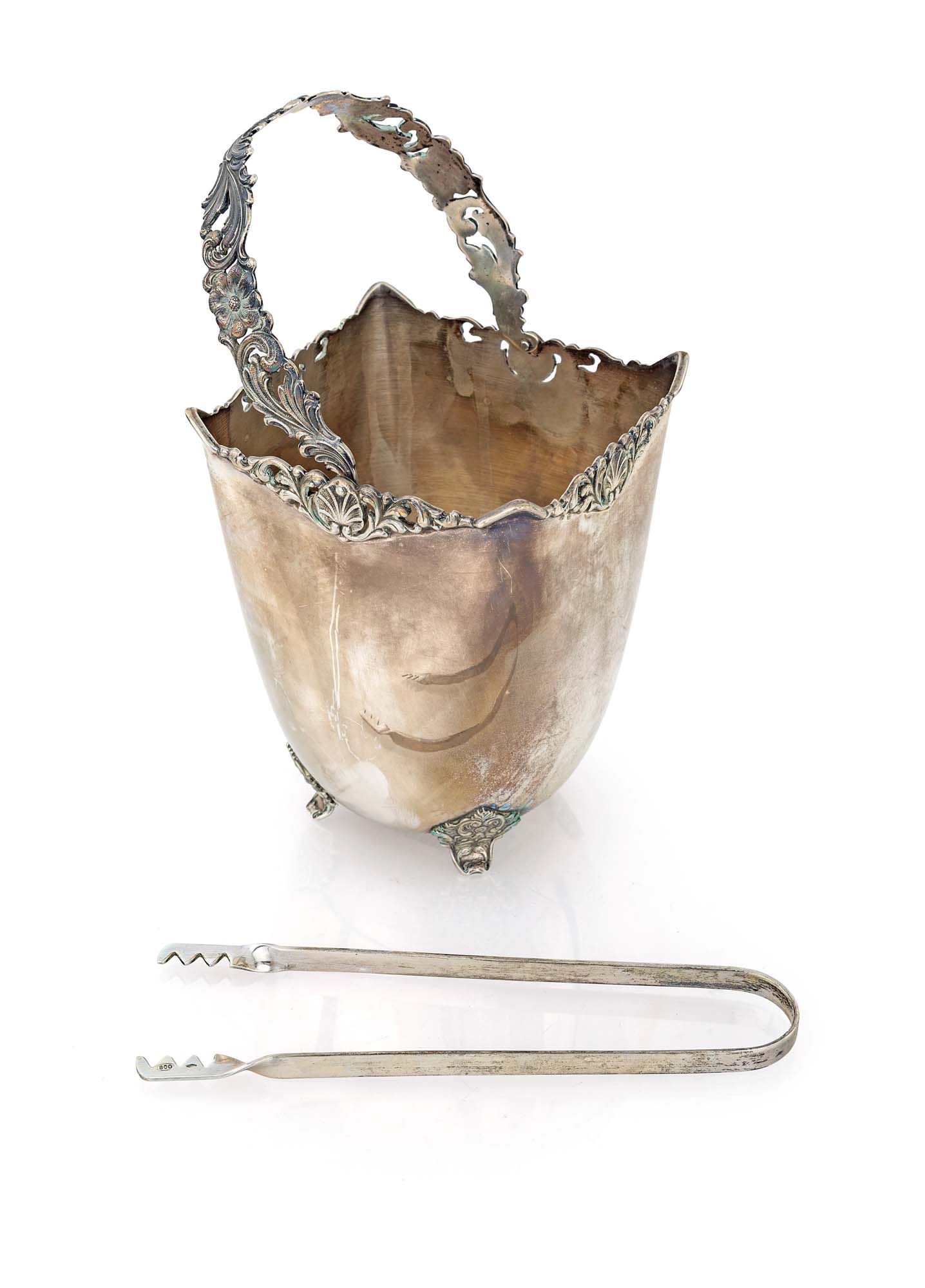 Secchiello portaghiaccio in argento con pinze struttura squadrata sorretta da piedi a cartiglio, ornata lungo il profilo superiore da volute vegetali e conchiglie, elementi decorativi ripresi lungo il manico unitamente a corolle cm 24x11x11 e cm 18 - peso complessivo gr. 504