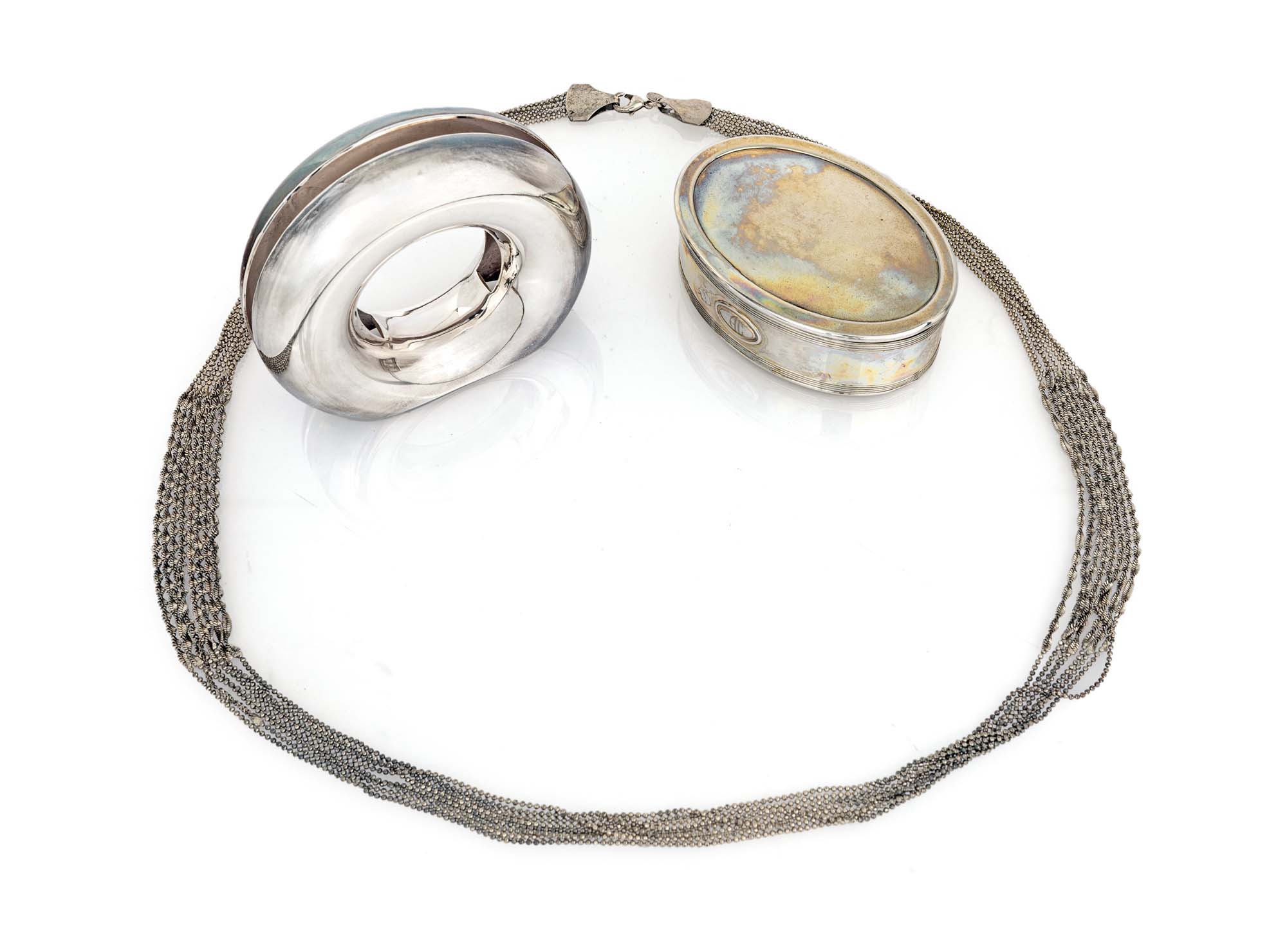 Portatovaglioli da tavolo, scatola ovale e collana in argento a diverso titolo il primo a forma di ciambella, entro scatola originale con garanzia; la scatola con iniziali A.C.; la collana costituita da otto fili di minuscole boules alternate a motivi torchon con chiusura a moschettone cm 9x10x3,5 - cm 3x10x7 - cm 88 rispettivamente - peso complessivo gr. 290