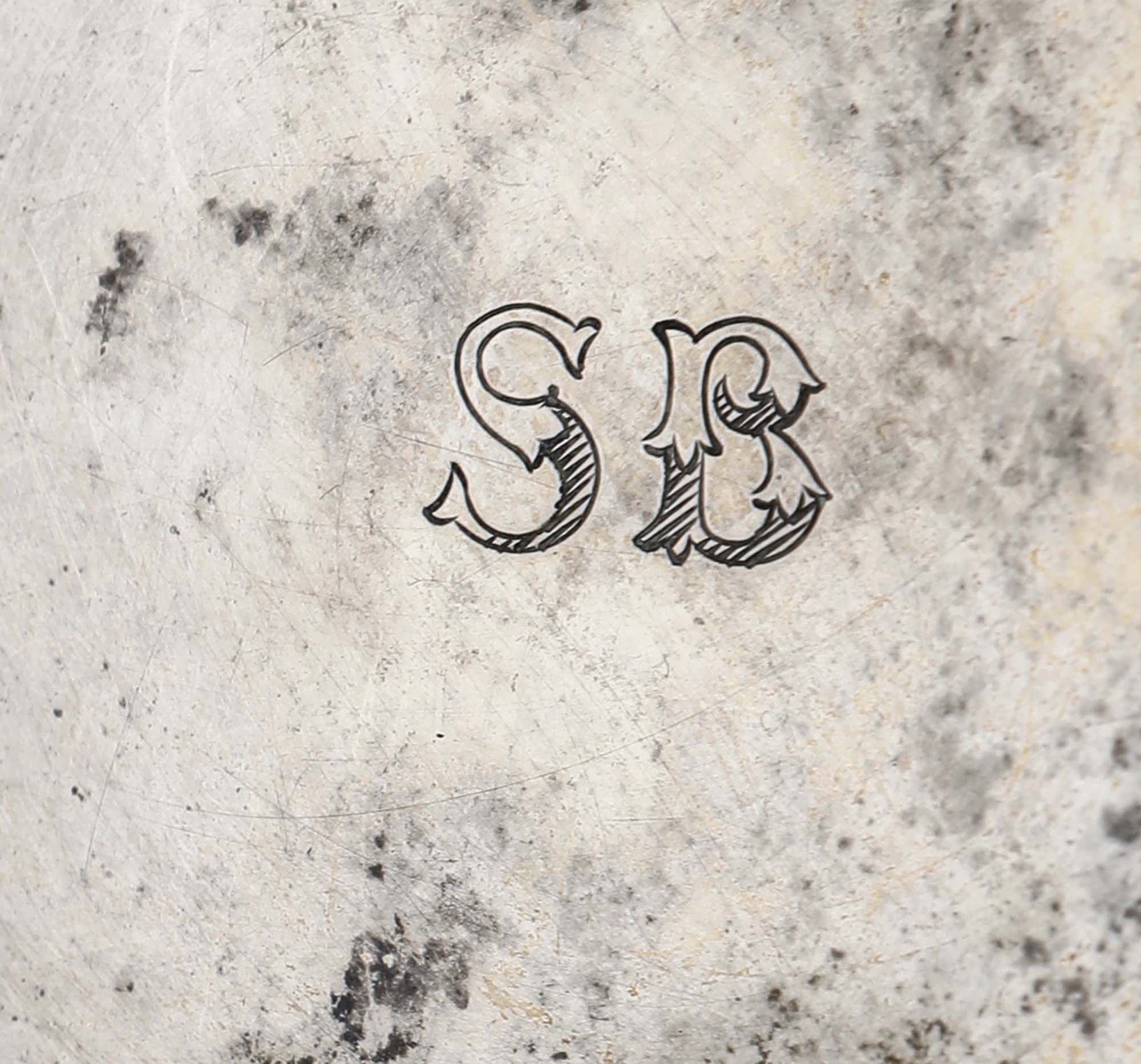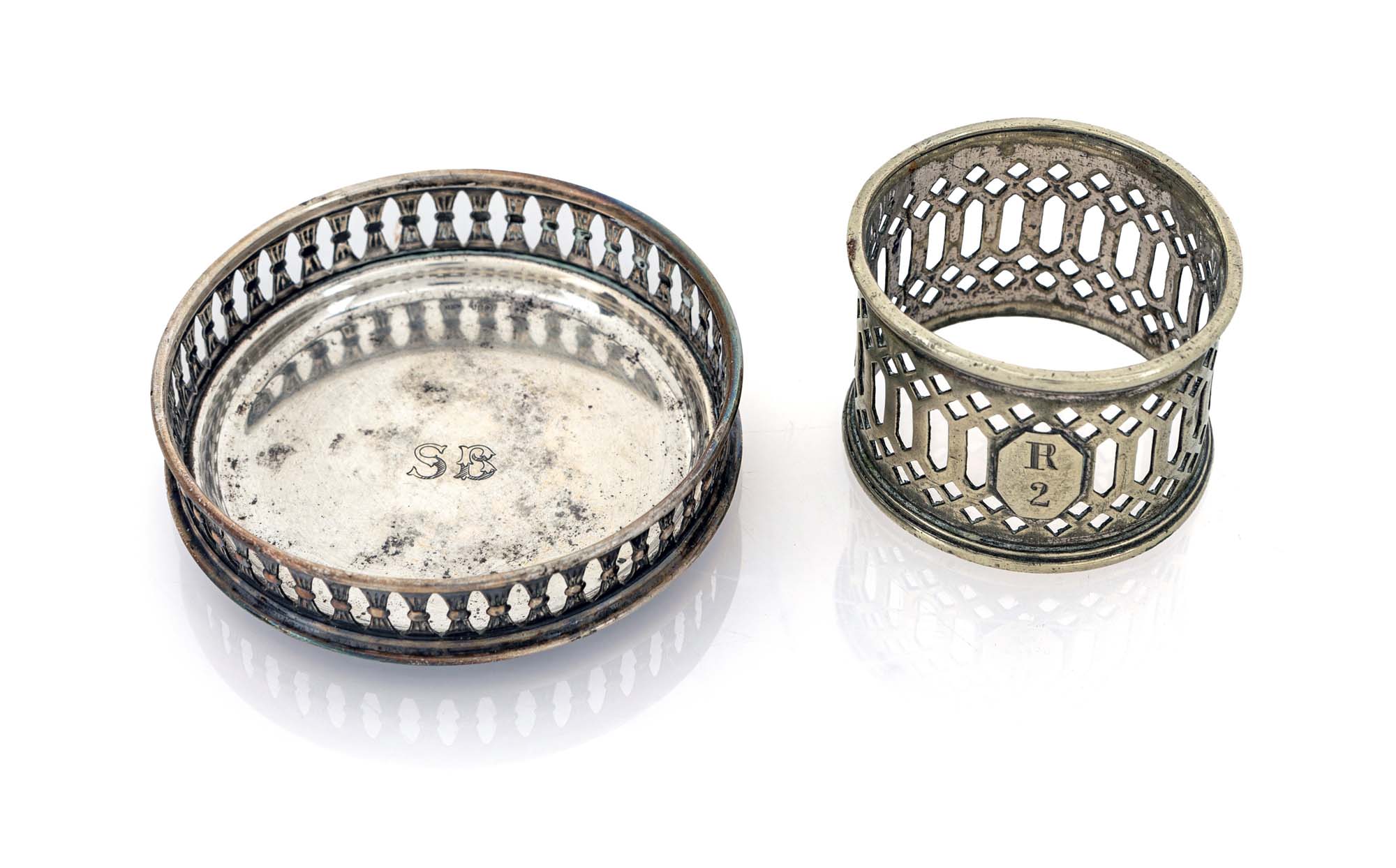 Sottobicchiere e portatovagliolo in argento traforato il primo racchiuso da ringhierina traforata con iniziali SB incise cm 1,8x7,3 e cm 3,5x4,5 - peso complessivo gr. 60