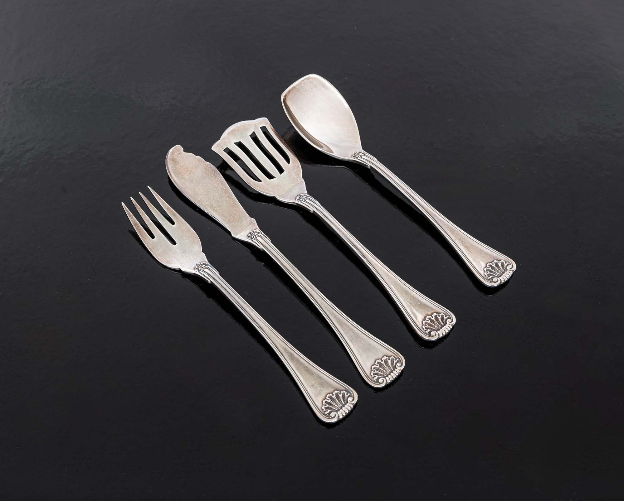 Quattro posate da antipasto in argento caratterizzate al vertice dell'impugnatura da conchiglia cesellata ripetuta al verso cm 13,5 (2) - cm 14 e cm 15 - peso complessivo gr. 126