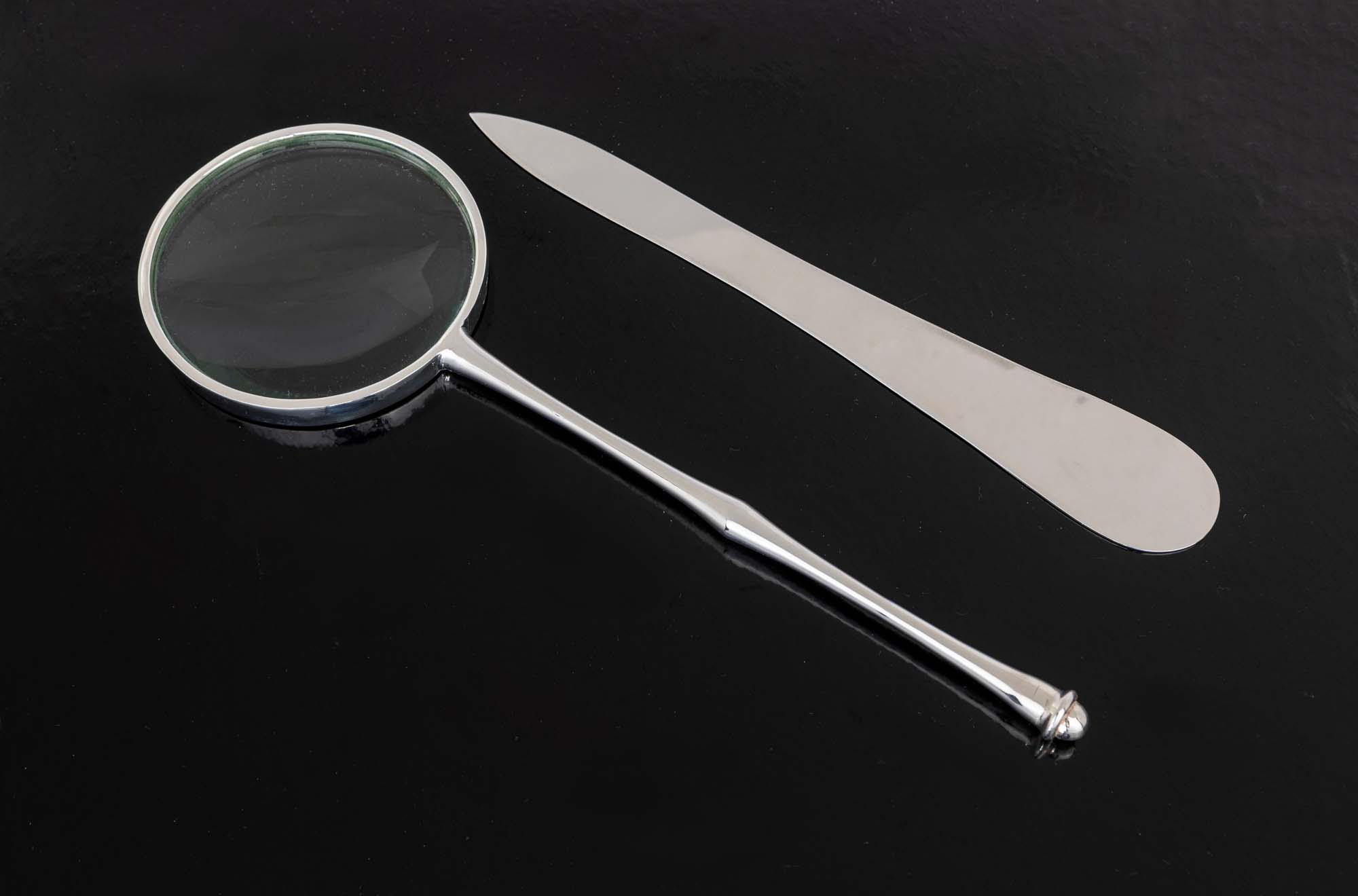 Due accessori da scrivania in argento 925/000 tagliacarte e lente d'ingrandimento con lunga impugnatura cm 21 - gr. 42 e cm 24,5x8 rispettivamente