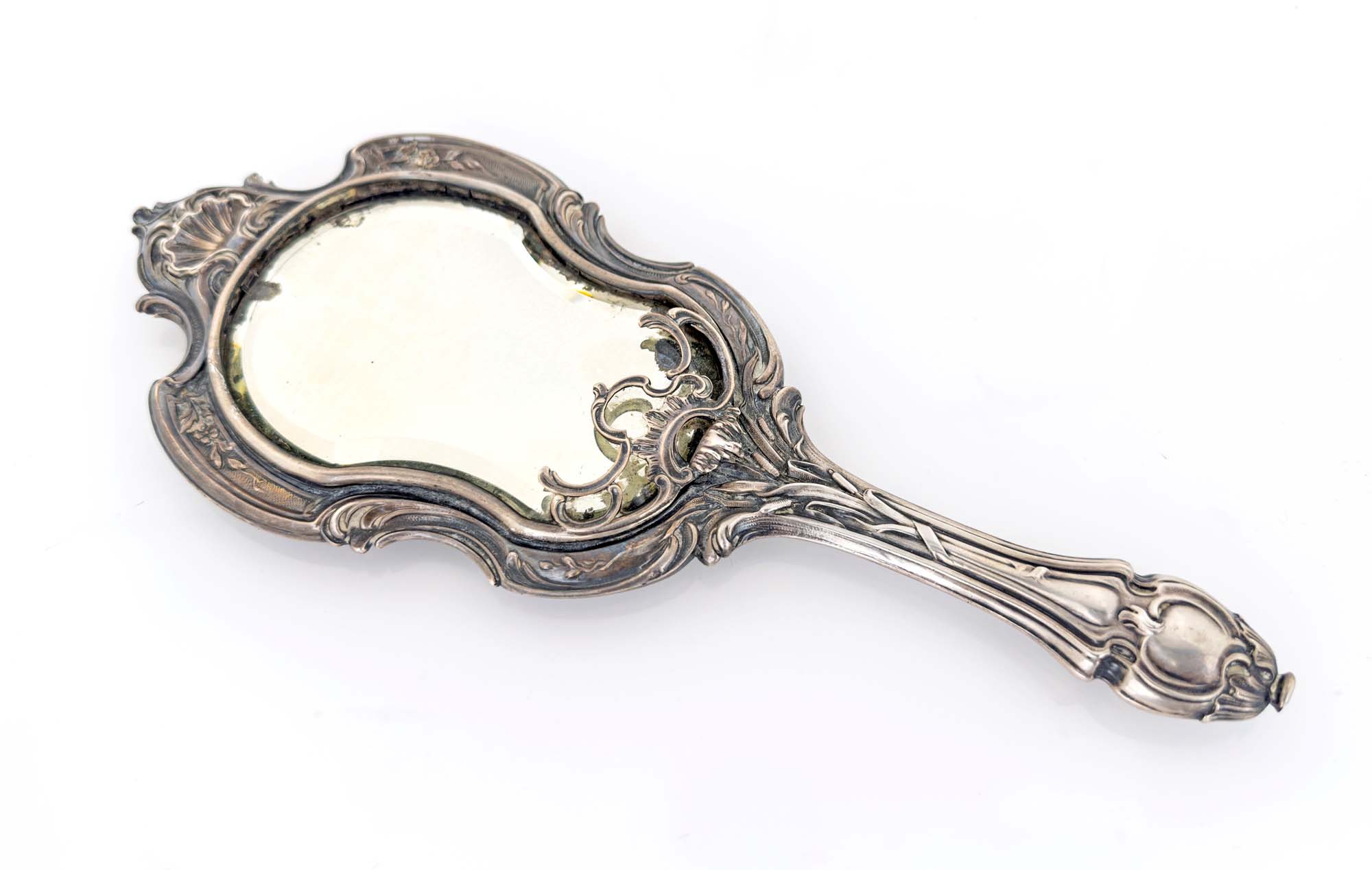 Specchio da toletta in lamina d'argento sbalzata cm 24,5x10