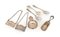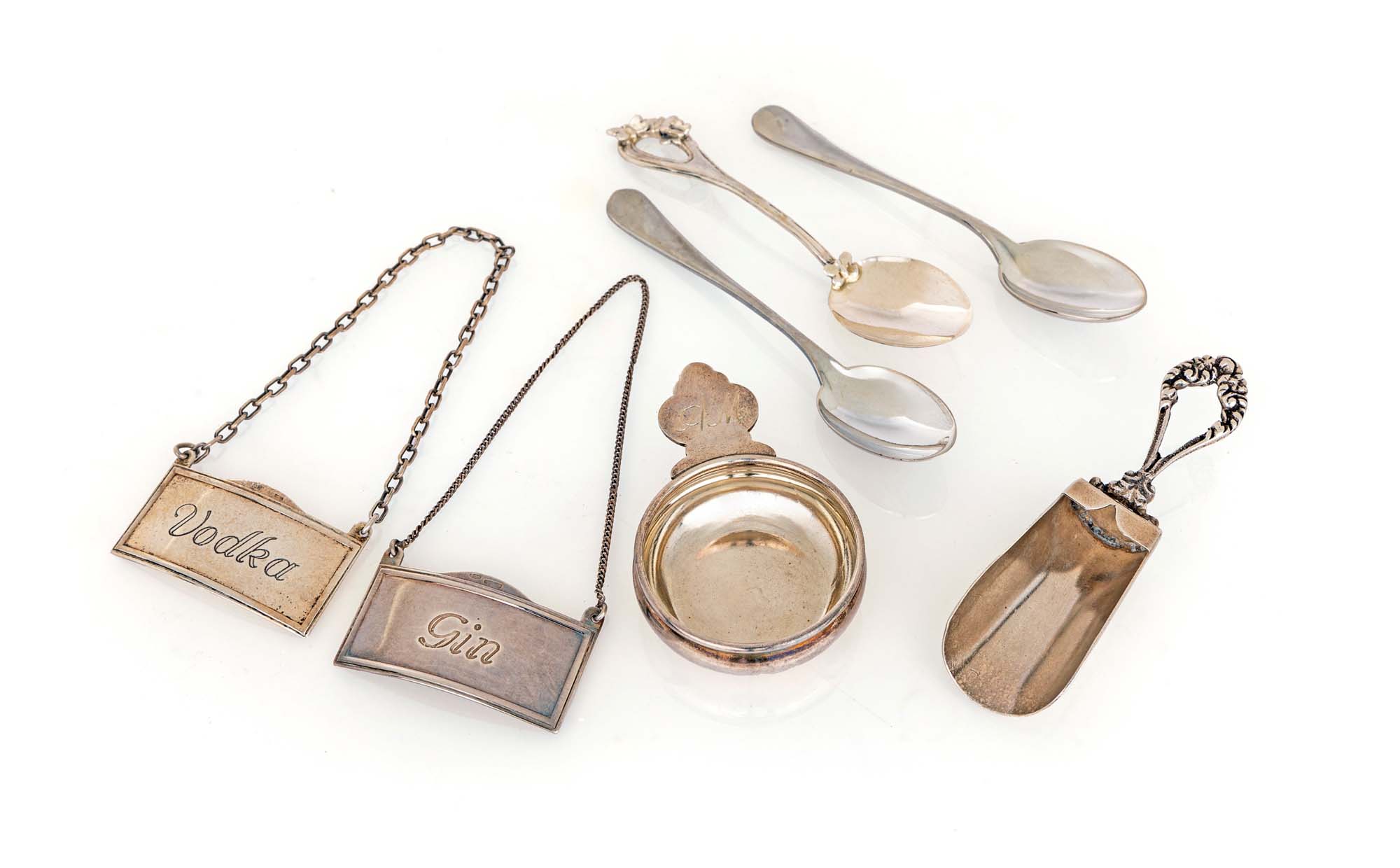 Lotto composto da sette oggetti in argento a diverso titolo due targhette "gin" e "vodka"; una paletta da zucchero; piccolo tastevin Brandimarte con iniziali A.M.; coppia di cucchiaini da caffè lisci ed un altro con farfalline peso complessivo gr. 84