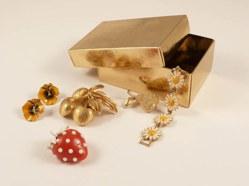 LOTTO DI BIJOUX - BIJOUX LOT di varie forme e tipologie tra cui una spilla realizzata a fragola, Trifari nei toni del rosso e del bianco e un bracciale dorato con margherite in smalto bianco e giallo (5)