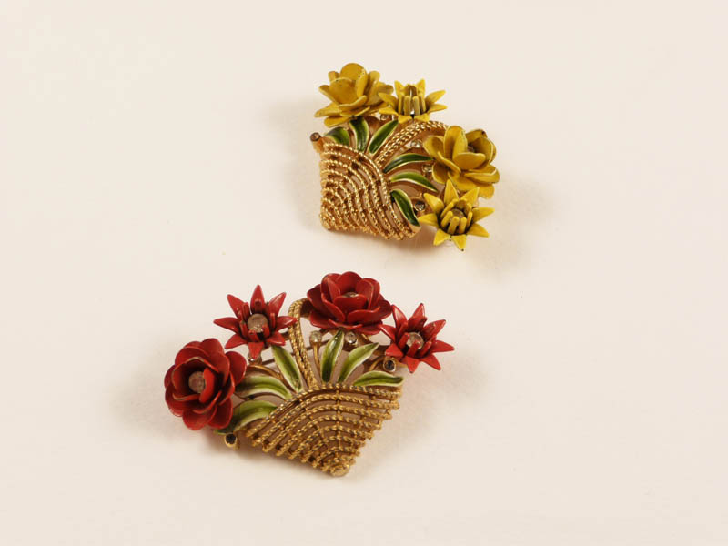 DUE SPILLE BIJOUX REALIZZATE A FORMA DI CESTINI DI FIORI - TWO BIJOUX BROOCHES WITH FLOWERS BASKETS Trifari una nei toni del rosso e l'altra del giallo, entrambe con dettagli in strass e smalto