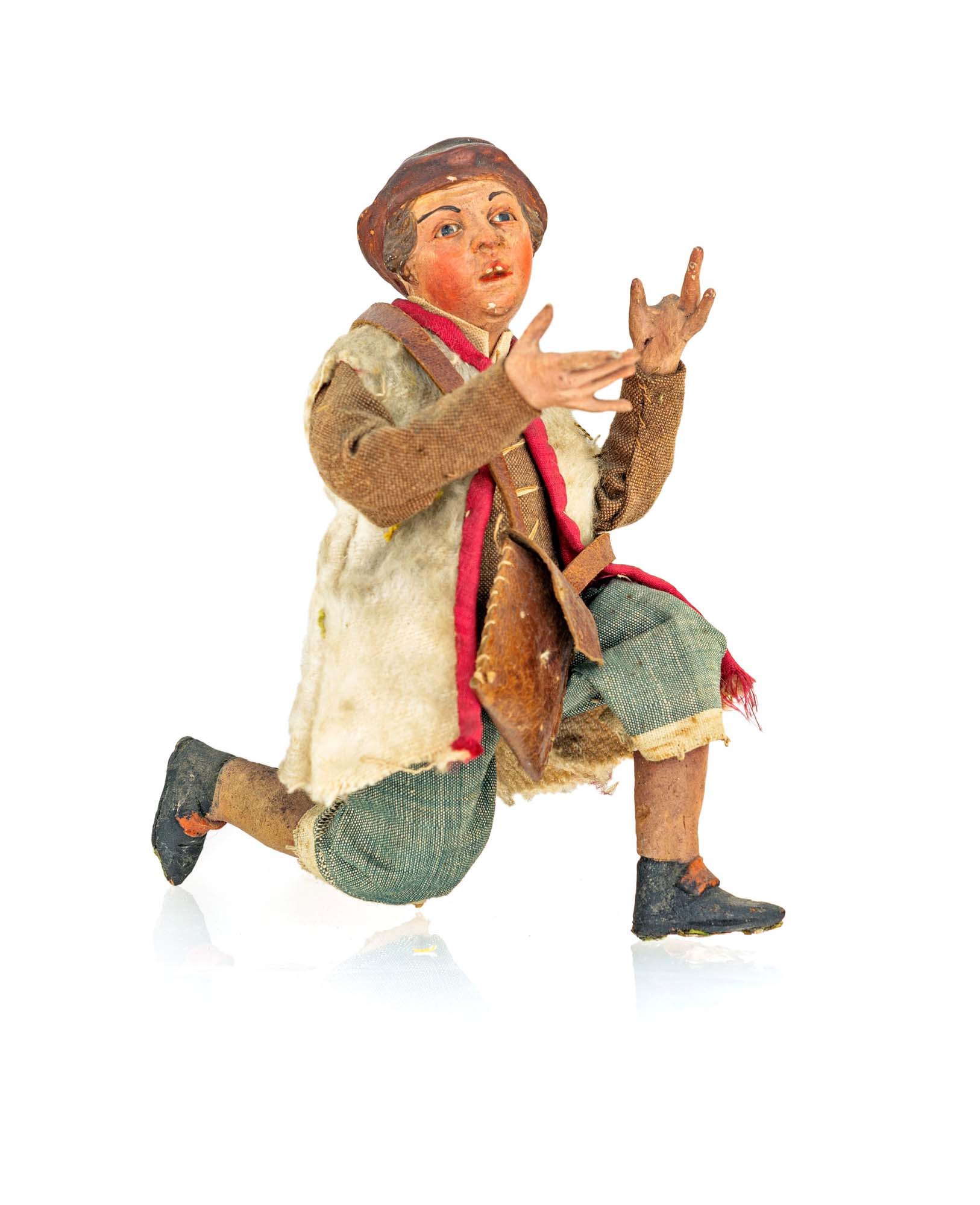 Giovane pastore della meraviglia con bisaccia, inginocchiato cappello modellato in creta bruna, camicia bianca, giacca beige e gilet di lana bianca orlato in rosso; pantaloni azzurri. Accessori: bisaccia. Difetti cm 14,5 Collezione Marchesi Gallo di Castrovillari (Cosenza)