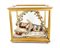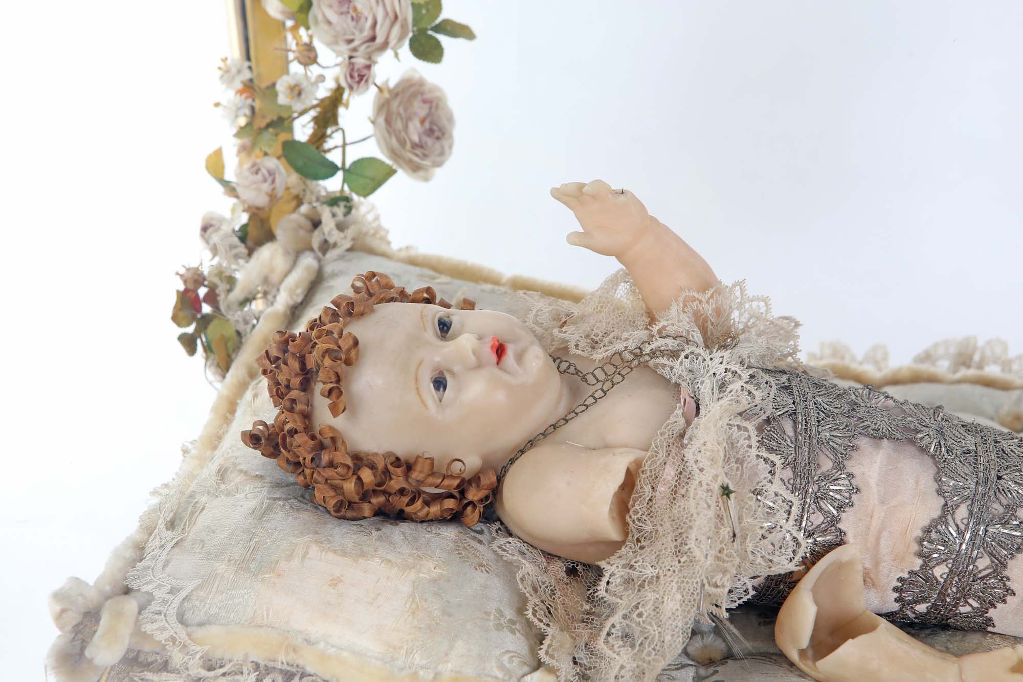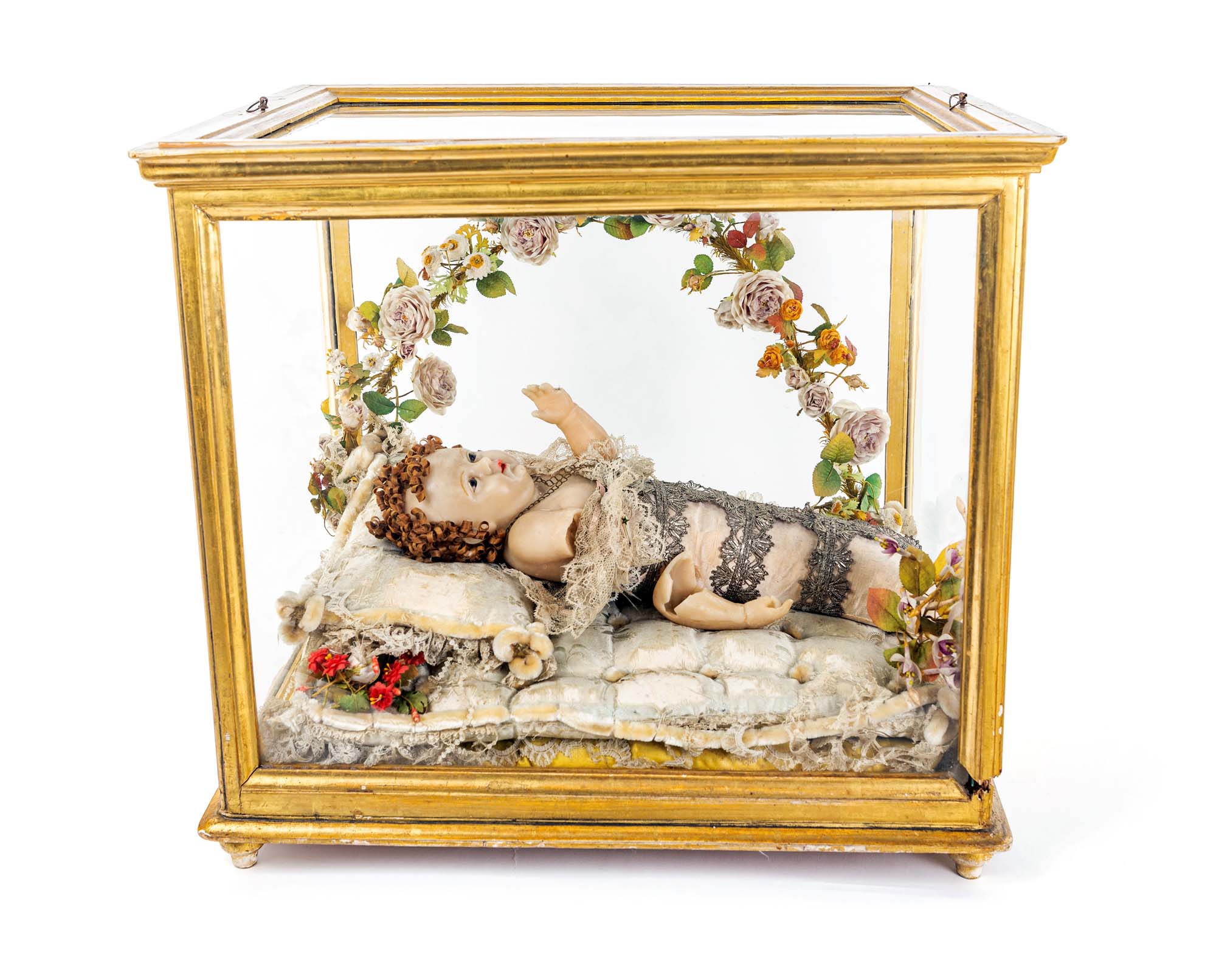 Bambinello in cera, XIX secolo caratterizzato da folta capigliatura di riccioli biondi, avvolto in fasce impreziosite e trattenute da merletto avorio e argenteo, entro teca in legno dorato a forma di parallelepipedo con cinque facce in vetro racchiuse da telaio modanato; apertura superiore, piedi a trottola. Rotture e mancanze cm 46x52x42 - il Bambino cm 40