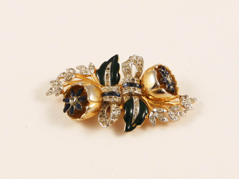 SPILLA BIJOUX "CORO DUETTE" CON CAMELIE TREBLANT - BIJOUX BROOCH "CORO DUETTE" WITH CAMELLIAS TREMBLANT Trifari, Anni Quaranta disegno di Adolph Katz realizzata in metallo dorato, smalto verde, baguettes azzurre e strass, pubblicato, formata da due clips