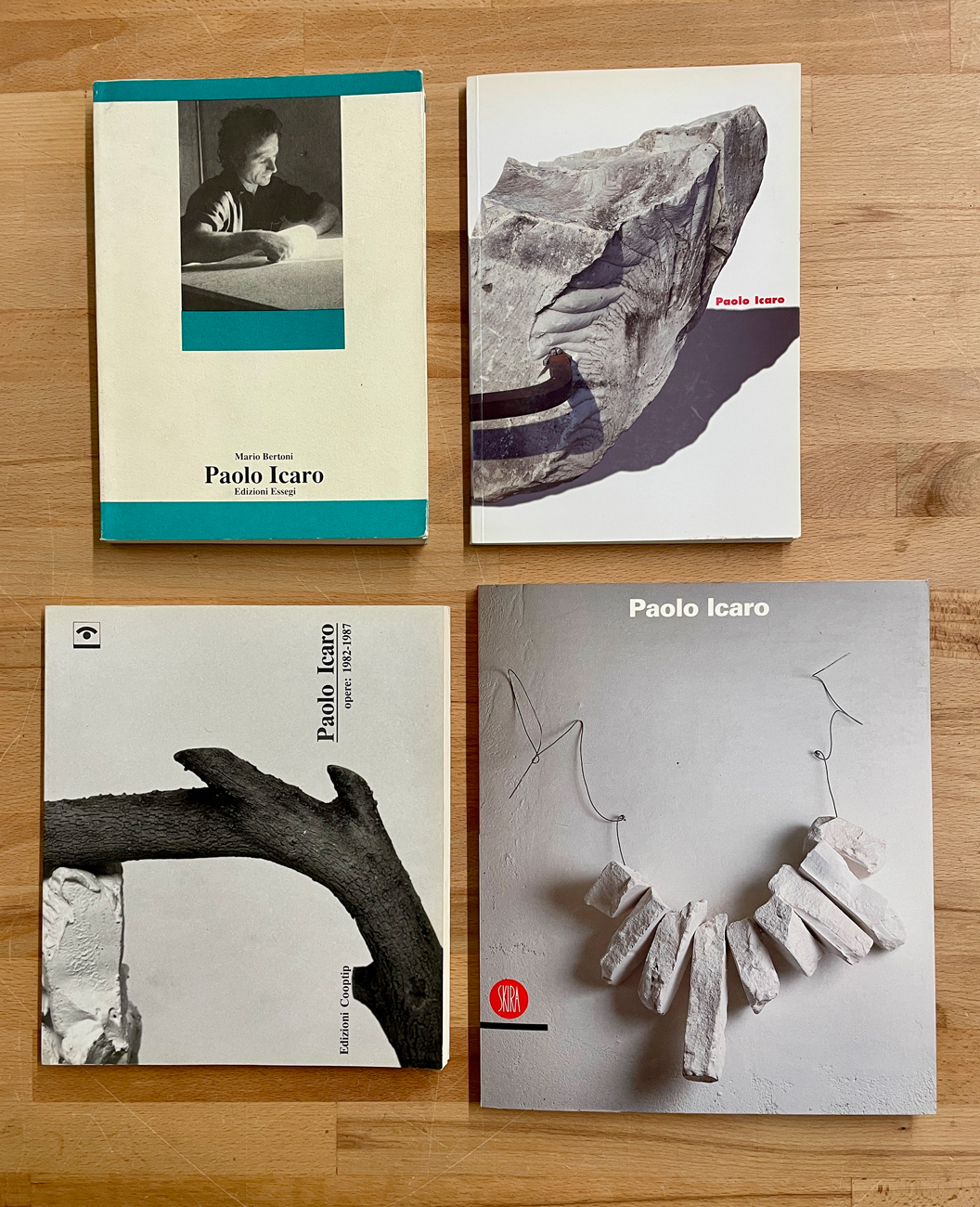 Paolo Icaro, 1990Catalogo riccamente illustrato a cura di Mario Bertoni, Alvaro Becattini e Danilo Montanari, edito per la collana 'Artisti Contemporanea', diretta da Giulio Guberti