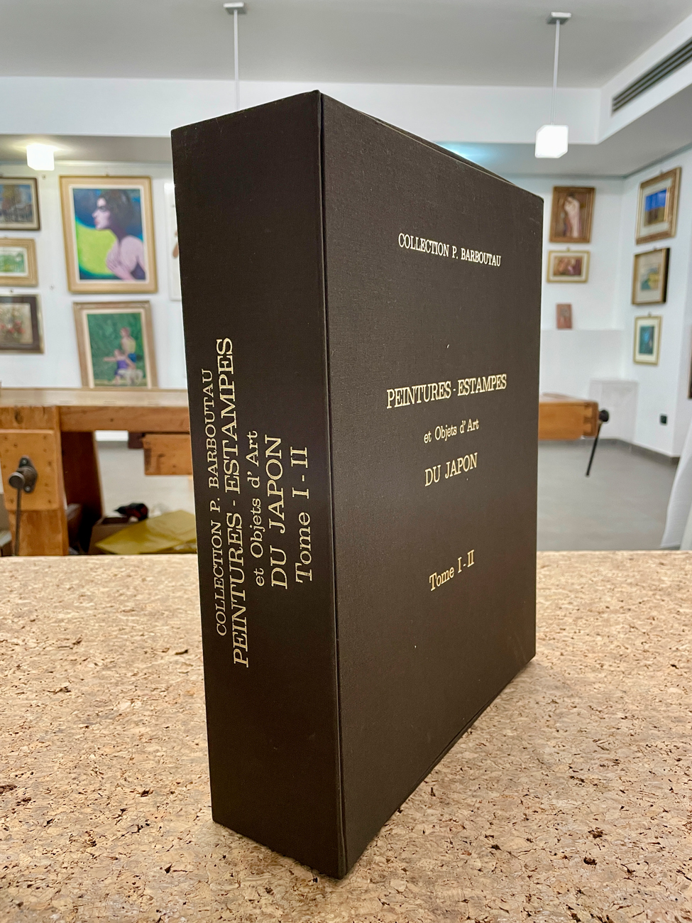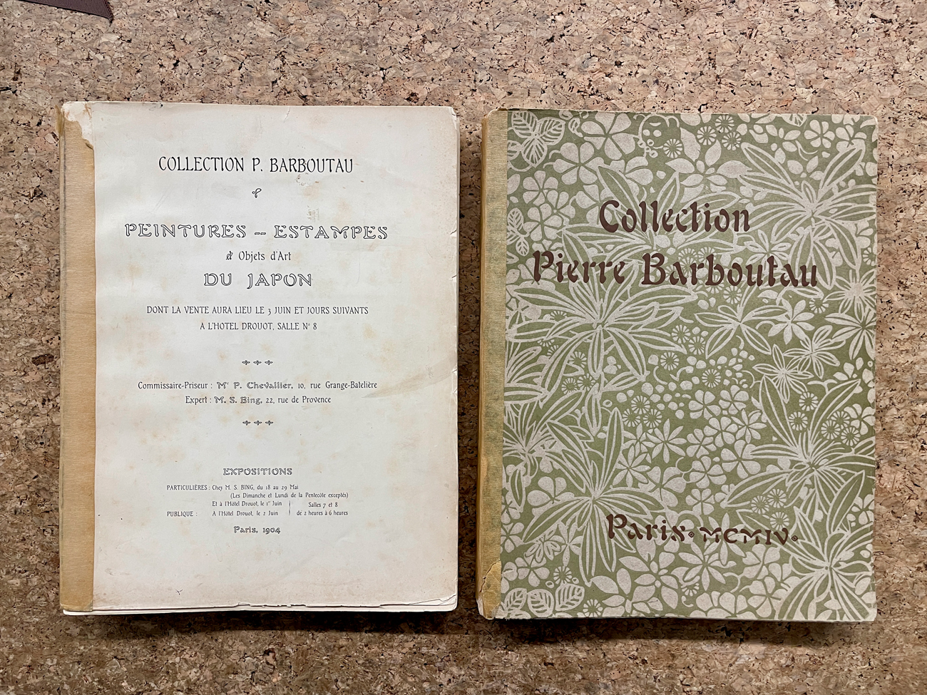 Cofanetto in cartone telato contenente due imponenti volumi editi in occasione della vendita della 'Collection P. Barboutau. Peintures - estampes et Objets d'Art du Japon' tenutasi presso Hotel Drouot, Parigi, 1904