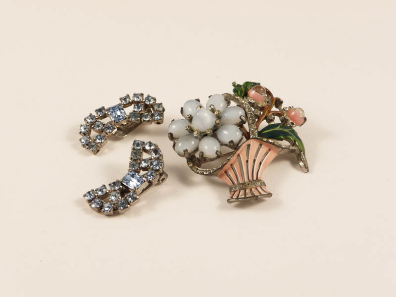 LOTTO DI BIJOUX - BIJOUX LOT un paio di orecchini realizzati a fiocco in strass incastonati azzurri e una spilla a cestino di fiori in strass e smalto nei toni del rosa e verde, fiori in pasta di vetro