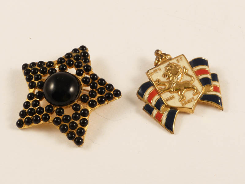 DUE SPILLE BIJOUX - TWO BIJOUX BROOCHES una a forma di stella Valentino Night, rivestita di perline nere in metallo dorato e un'altra a forma di fiocco in smalti blu, rosso e bianco con stemma raffigurante un leone dorato su fondo bianco