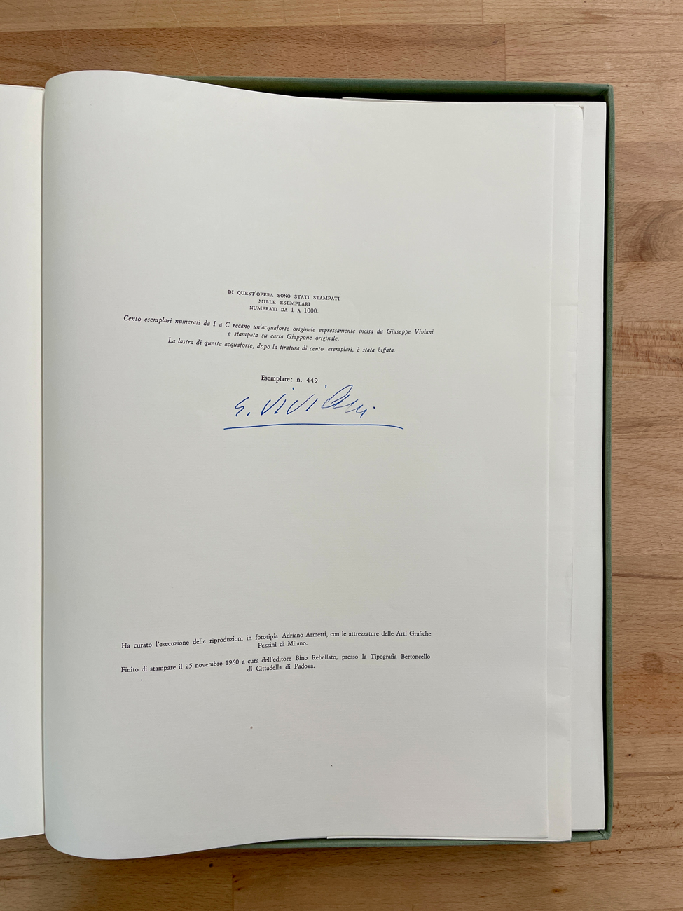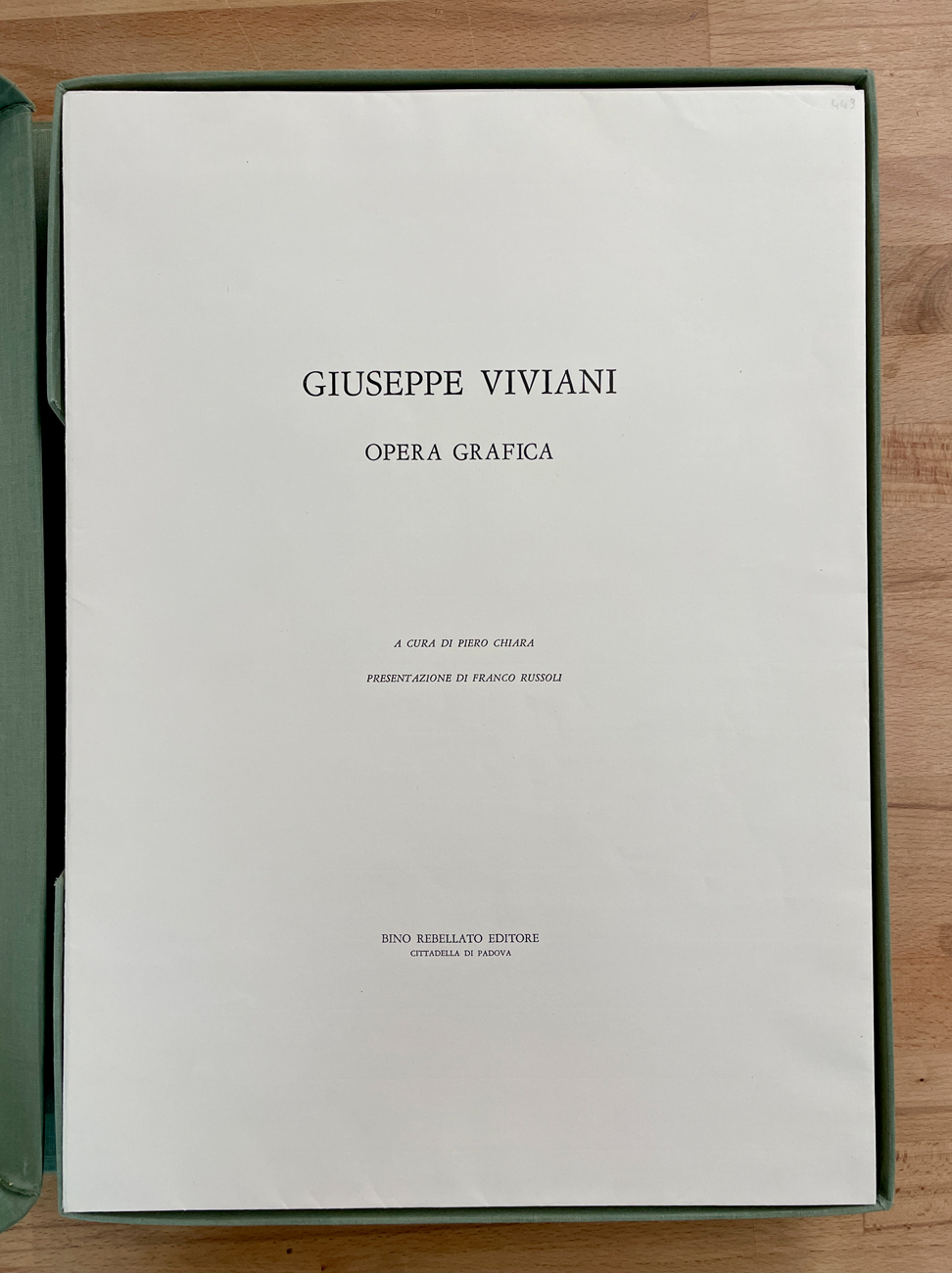 Cofanetto recante fascicolo introduttivo a cura di Piero Chiara con presentazione di Franco Russoli e 98 riproduzioni in fototipia di opere grafiche di Giuseppe Viviani, ciascuna delle quali entro pieghevole di presentazione
