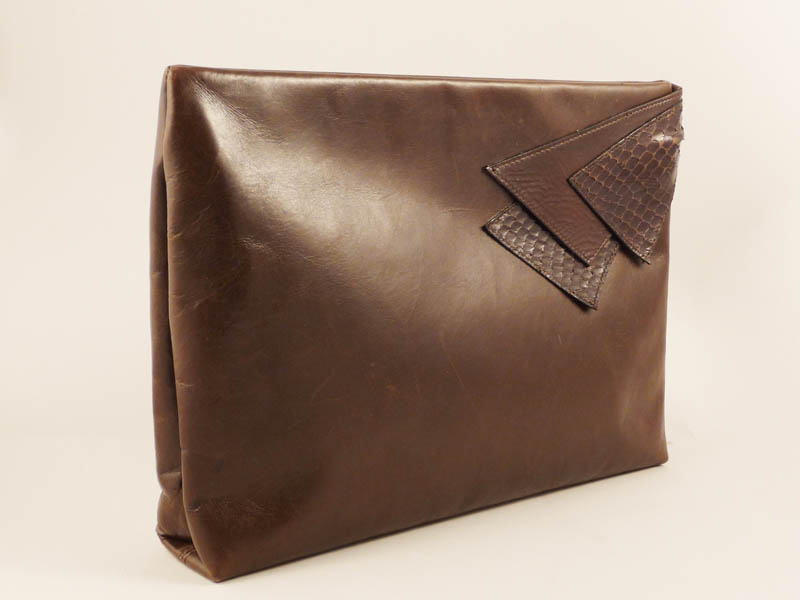 POCHETTE IN PELLE MARRONE CON DETTAGLI A VENTAGLIO IN PELLE LAVORATA - BROWN LEATHER POCHETTE WITH LEATHER DETAILS Salvatore Ferragamo Anni Ottanta modello a busta con sottile tracolla in pelle, lievi difetti