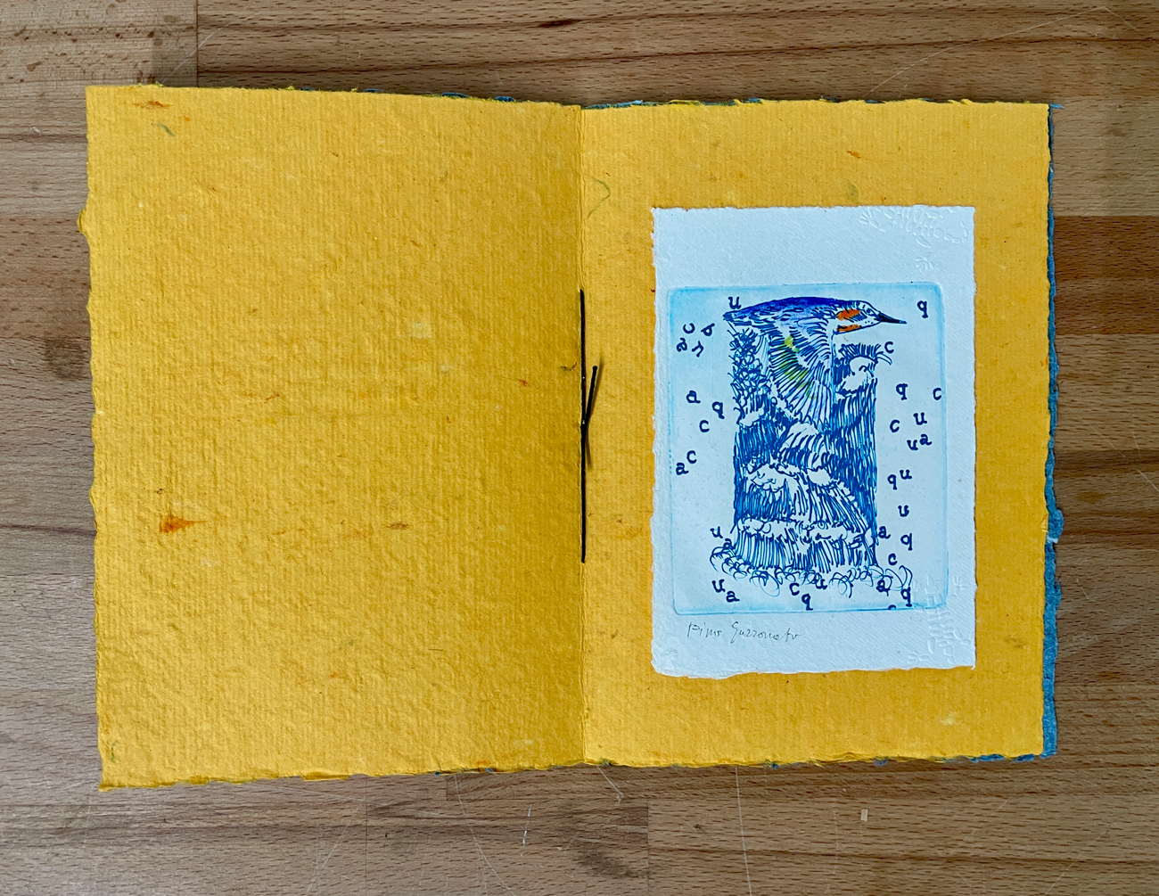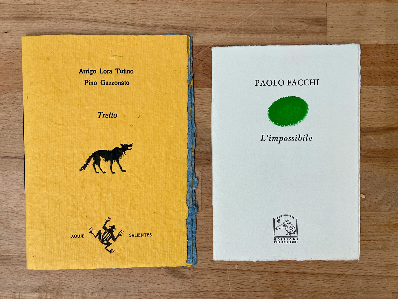 Edizione d'arte realizzata su carte a mano di canapa e jean recante all'interno testi di Arrigo Lora-Totino e un'acquaforte di Pino Guzzonato (acquaforte recante firma a matita al fronte)