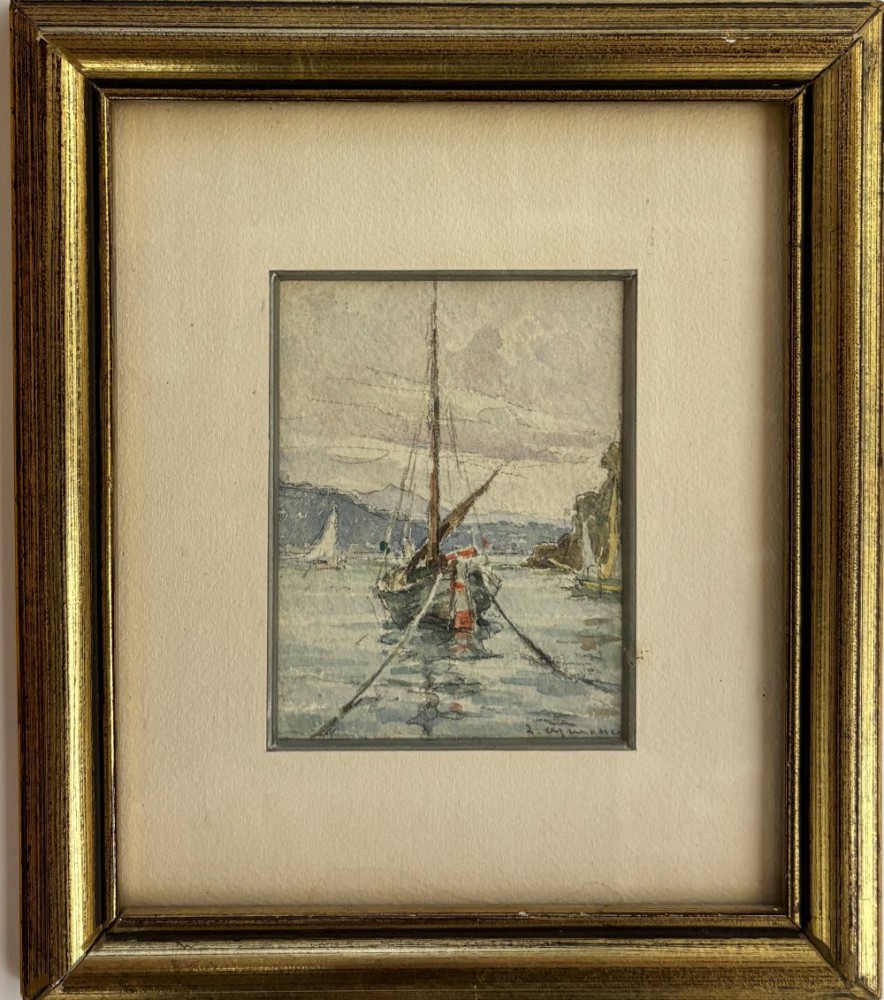 Lidio Ajmone Coggiola (BI) 1884 - 1945 Andezeno (TO), Paesaggio lacustre Acquarello su cartoncino cm 9x11 firmato in basso a dx