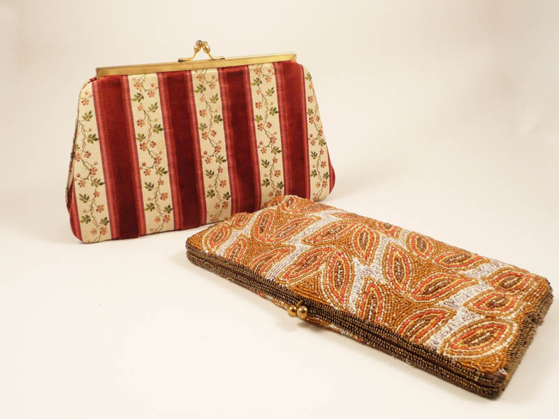 DUE POCHETTE DA SERA - TWO NIGHT POCHETTE una con chiusura a scatto ricamata a motivi vegetali in perline colorate nei toni dell'arancio, oro e bronzo e un'altra in tessuto a fantasia floreale nei toni del rosa su fondo panna con dettagli a strisce in velluto bordeaux, chiusura a scatto dorata, difetti