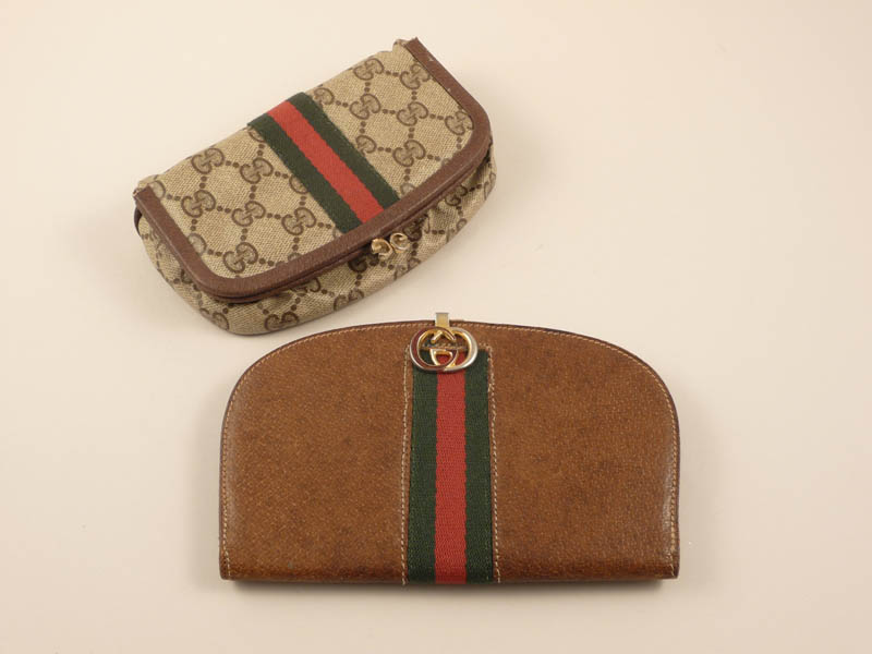 LOTTO - LOT Gucci portafoglio in cinghiale nocciola, passamaneria verde e rossa, chiusura con G dorate e un necessaire in tessuto cerato a fantasia monogram con passamaneria verde e rossa, specchio e chiusura impreziosita da dettagli di G ad incastro, lievi difetti (2)