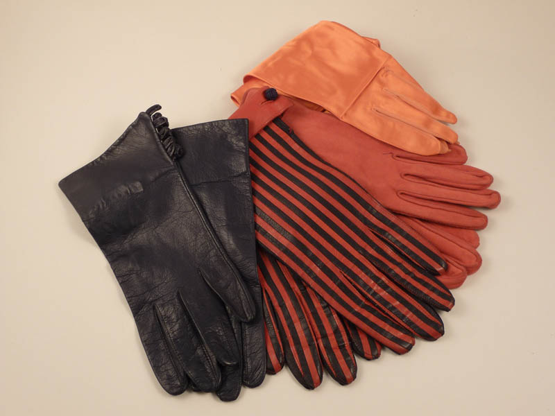 LOTTO DI GUANTI TRA CUI UN PAIO DA SERA IN RASO ROSA - LOT OF GLOVES INCLUDING A PAIR IN PINK SATIN un paio scamosciato nei toni del rosa e un paio neri in pelle, Valentino un altro in pelle a righe verticali nei toni del nero e del rosso con piccoli bottoncini in corda blu intrecciati (4)
