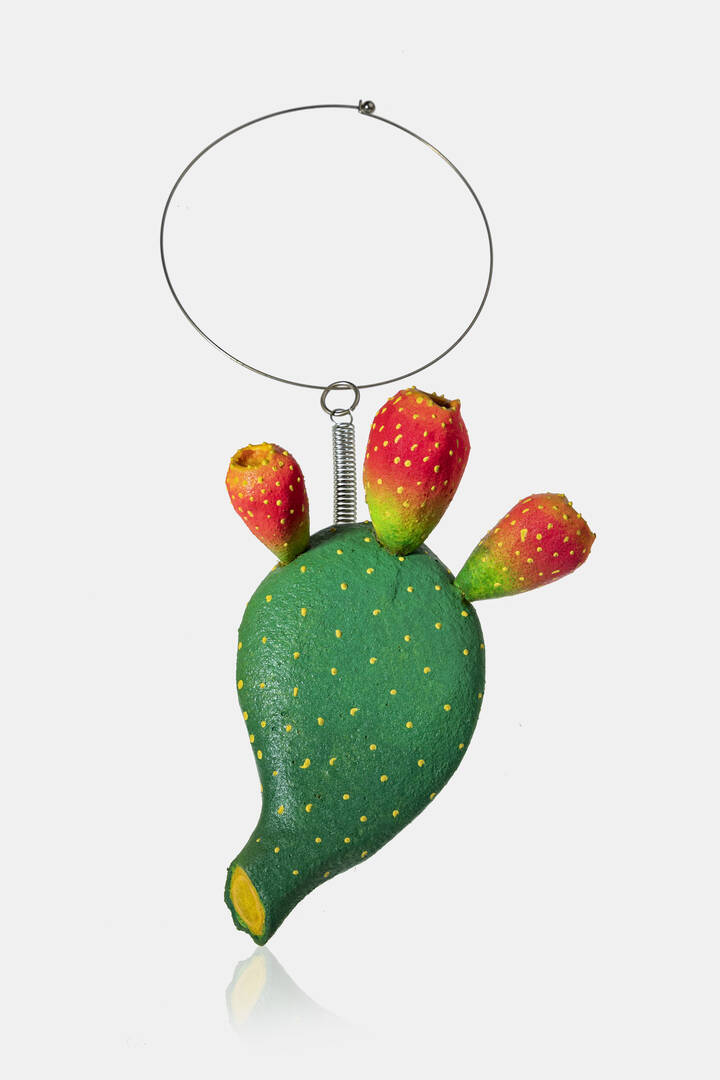 Collana in metallo dorato con molla centrale trattente grande ciondolo a forma di cactus in poliuretano espanso e dipinto. Firmata "Gilardi 2000".