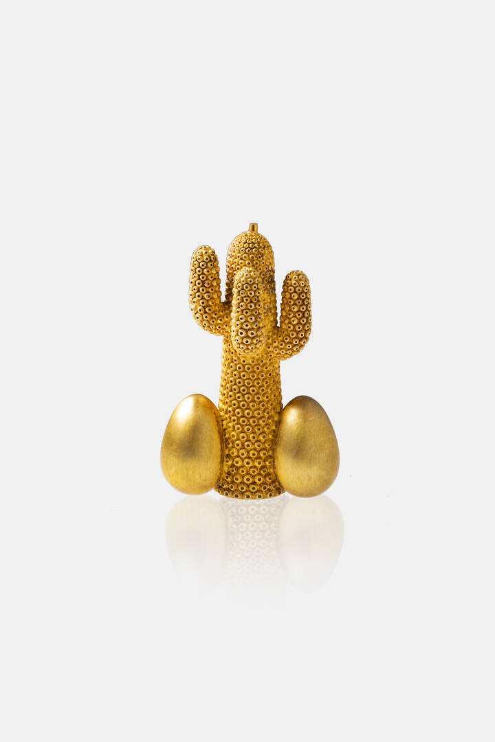 Spilla in argento vermeille lucido e satinato, a forma di cactus con uova alla base.