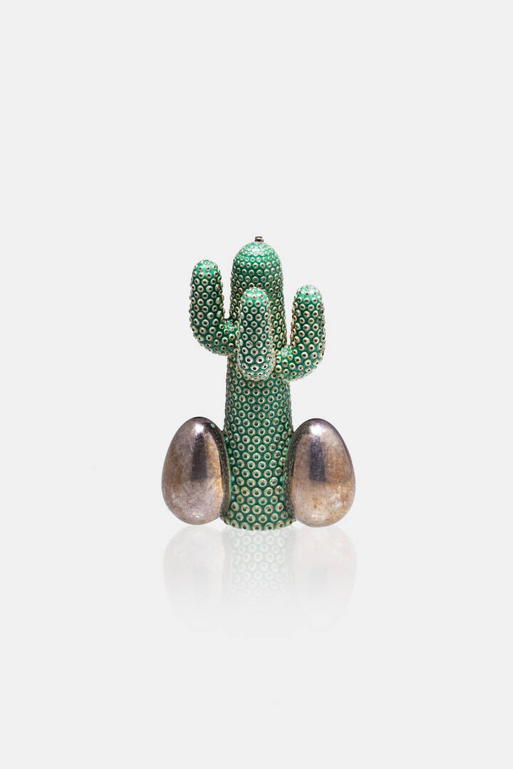 Spilla in argento e smalto verde, a forma di cactus con uova alla base.