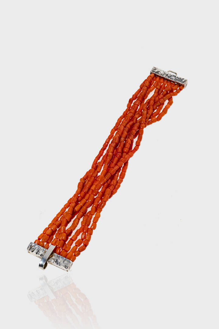 Bracciale composto da dieci fili di barilotti di corallo mediterraneo nei toni del salmone, firmato "Ascione", con chiusura in argento 925/1000.