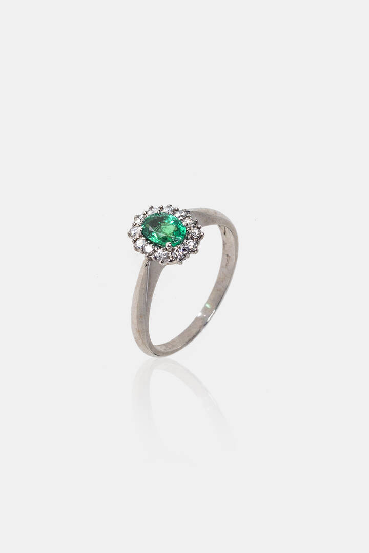 in oro bianco con smeraldo centrale di ct 0,57 e diamanti taglio brillante per totali ct 0,16 ca, probabile colore G-H, purezza VVS