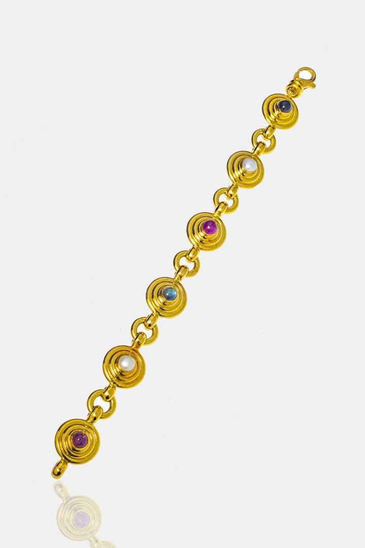 in oro giallo, composto da elementi geometrici rotondi con al centro zaffiri, rubini cabochon e due perle. Firmato "G&B".