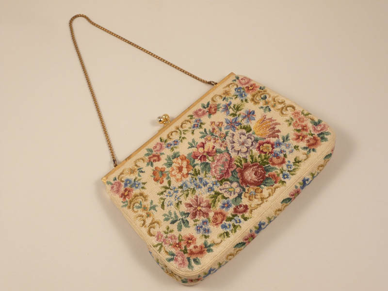 BORSETTA DA SERA RICAMATA A PICCOLISSIMO PUNTO - EVEVING BAG EMBROIDER Spulcioni Firenze ricamata a motivi floreali in vari colori su fondo panna, fermezza e piccola catena dorata