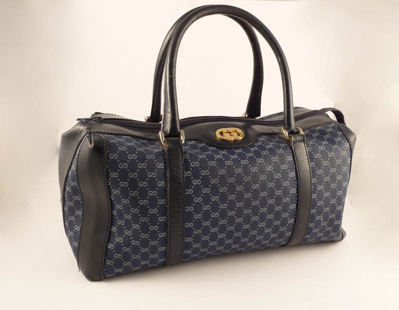 BORSA A MANO IN PELLE E TESSUTO MONOGRAM BLU - LEATHER AND BLU MONOGRAM HAND BAG Gucci realizzata a bauletto con logo in metallo dorato, difetti