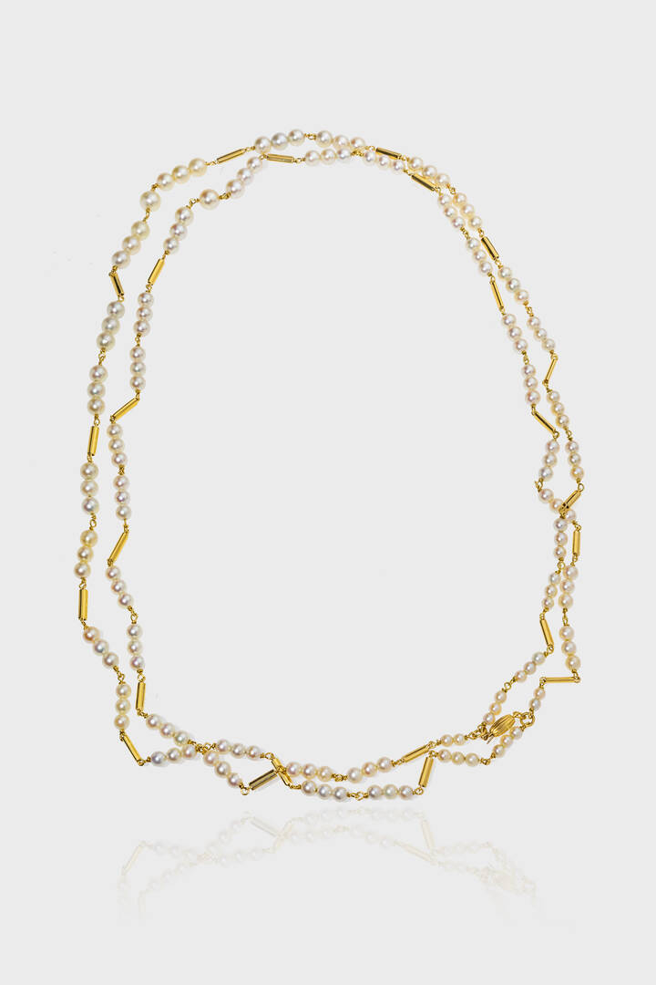 composta da due fili di perle giapponesi a scalare dal diam. di mm 4,8 a 9,5 ca, alternate a segmenti in oro giallo.