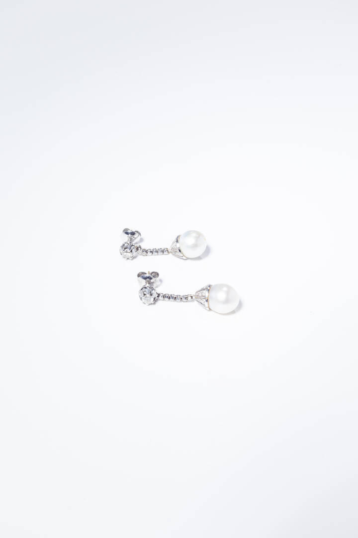 in oro bianco, a vite, corpo in diamanti taglio 8/8 e diamante per totali ct 0,70 ca, terminanti con due perle giapponesi scaramazze del diam. di mm 10,4 ca.