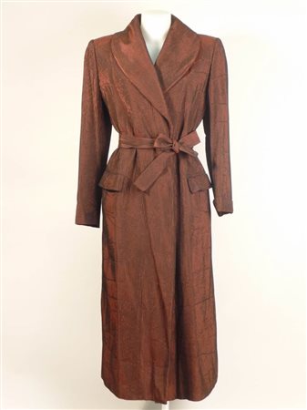 CAPPOTTINO BORDEAUX IN SETA OPERATA A COSTE - BORDEAUX SILK COAT Enrico Coveri tasche con pattine, modello lungo, chiusura con cintura abbinata tg L circa
