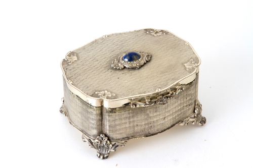 Jewellery box in 800 silver chiseled with lapis lazuli cabochon, approx. 260 gr. Hallmarks on the bottom. 20th century.