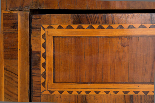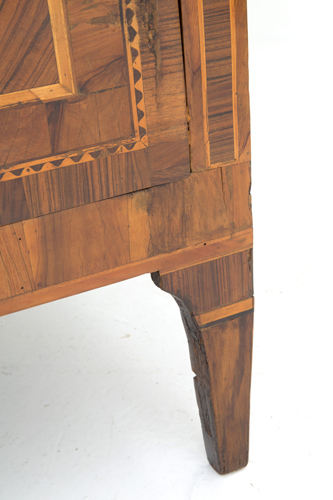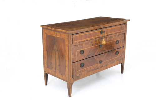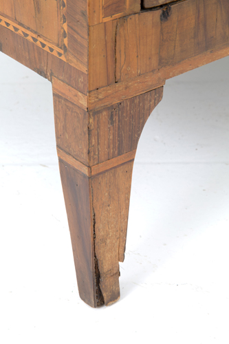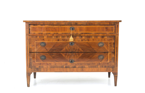 Chest of drawers veneered and threaded in various woods with three drawers on the front. Lombardy. Louis XVI period. Defects. 83.5x121x55 cm approx. Comò lastronato e filettato in legni di varie essenze con tre cassetti sul fronte. Lombardia. Periodo Luigi XVI. Difetti. 83,5x121x55 cm ca.