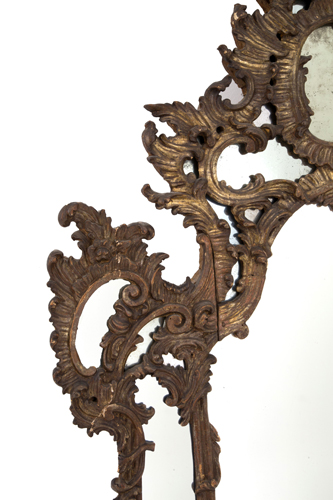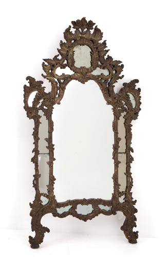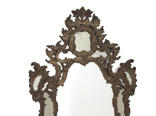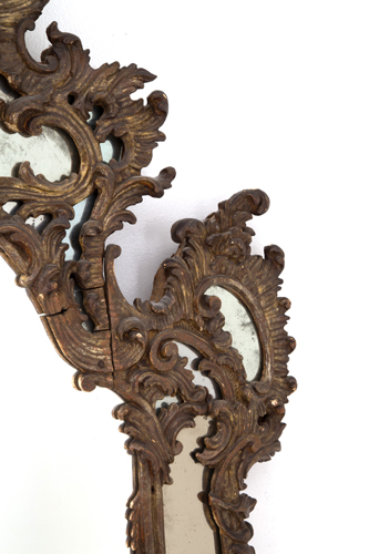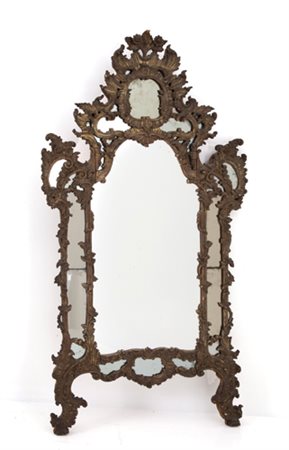 Carved and gilded wooden mirror in Mecca. Piedmont. 17th century. Defects. 184x100 cm approx. Specchiera in legno intagliato e dorato a mecca. Piemonte. XVIIl secolo. Difetti. 184x100 cm ca.