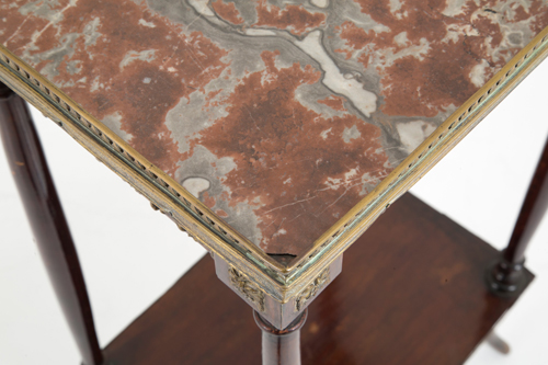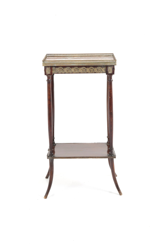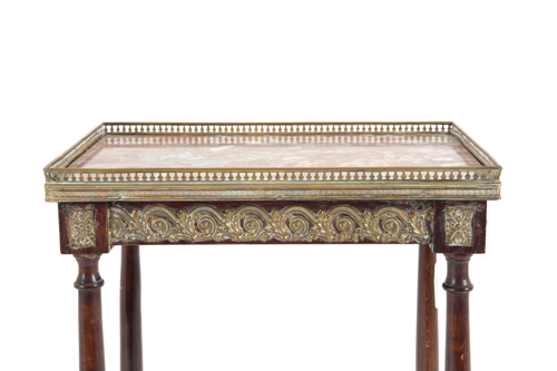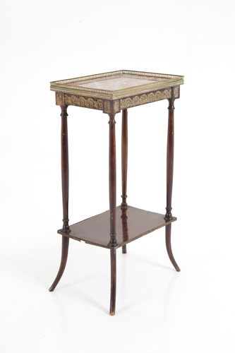Mahogany center cabinet with turned columns, sabre legs, gilded bronze applications and marble top. Napoleon III period. Defects. 86x44.5x32 cm approx. Mobiletto da centro in mogano con colonne tornite, gambe a sciabola, applicazioni in bronzo dorato e piano in marmo. Periodo Napoleone III. Difetti. 86x44,5x32 cm ca.