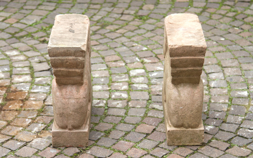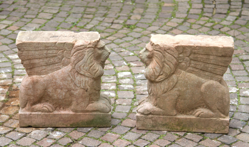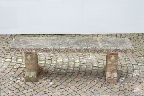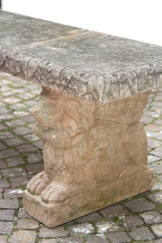 Garden bench in agglomerate stone with lion-shaped feet in red Verona marble. 19th century. Defects. 41x135x34 cm approx. Panchina da giardino in agglomerato di pietra con piedi a foggia di leoni in marmo rosso di Verona. XIX secolo. Difetti. 41x135x34 cm ca.