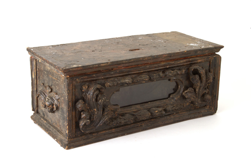 Carved and lacquered wooden almoner with glass window. 17th century. Defects. 22x53x24.5 cm approx. Elemosiniere in legno intagliato e laccato con finestrella in vetro. XVII secolo. Difetti. 22x53x24,5 cm ca.