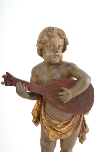 Pair of lacquered and gilded wooden sculptures depicting "MUSICAL PUTTI". Late 17th-early 18th century. Defects and missing parts. 92x46x23 cm approx. Coppia di sculture in legno laccato e dorato raffiguranti "PUTTI MUSICANTI". Fine XVII-inizi XVIII secolo. Difetti e mancanze. 92x46x23 cm ca.