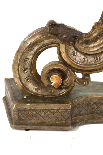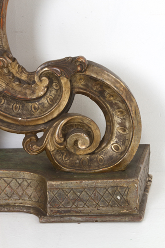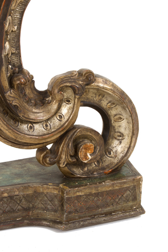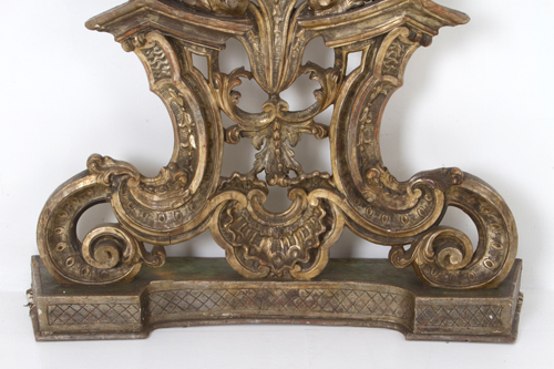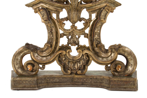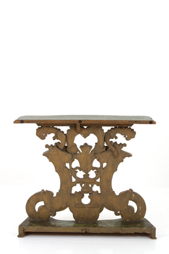 Pair of carved, lacquered and gilded wooden consoles in mecca. 18th century. Defects and missing parts. 97x113x32 cm approx. Coppia di consolle in legno intagliato, laccato e dorato a mecca. XVIII secolo. Difetti e mancanze. 97x113x32 cm ca.