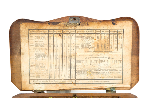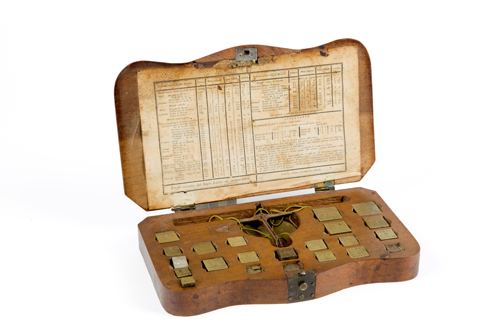 Antique scale complete with weights with original wooden case. Late 18th century. 3x25x14.5 cm approx. Antica bilancia completa di pesi con custodia di legno originale. Fine XVIII secolo. 3x25x14,5 cm ca.