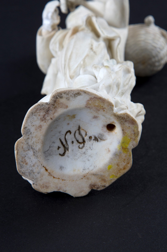 Bisque sculpture depicting "BOY WITH BASKET AND BIRDS". With unidentified writing on the bottom. Naples. Period Ferdinand IV. Slight losses. Height approx. 15 cm. Scultura in bisquit raffigurante "FANCIULLO CON CESTA E VOLATILI". Con scritta non identificata sul fondo. Napoli. Periodo Ferdinando IV. Lievi mancanze. Alt. 15 cm ca.