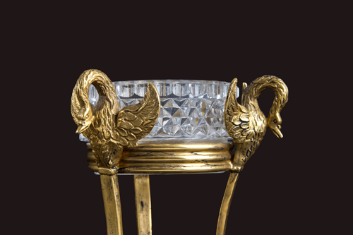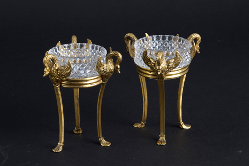 Pair of small bronze stands with swan-shaped terminals and cut crystal. Directoire period. 11.5x9 cm approx. Coppia di piccole alzatine in bronzo con terminali a forma di cigno e cristallo molato. Periodo Direttorio. 11,5x9 cm ca.