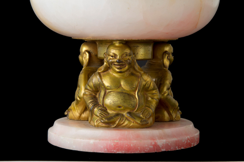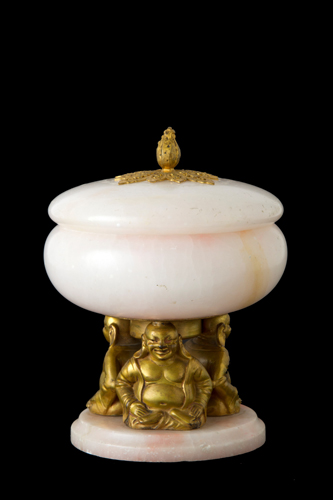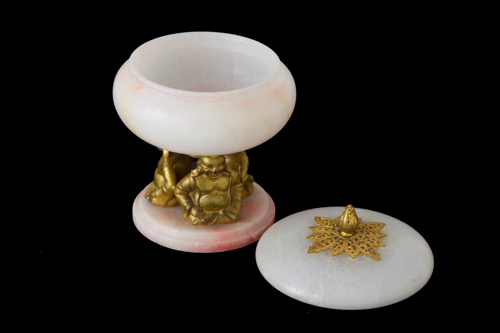 Alabaster and gilded bronze stand with lid and supports depicting "SEATED BUDDHA". 19th century. 15x11 cm approx. Alzatina con coperchio in alabastro e bronzo dorato con supporti raffiguranti "BUDDHA SEDUTO". XIX secolo. 15x11 cm ca.